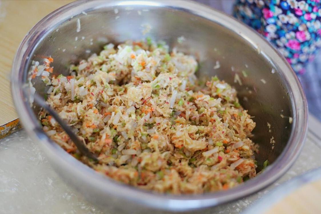 4、接下來將蘿蔔攥幹,倒在一個大點的盆裏,再把雞蛋倒進去,然後將泡好的粉條切碎後,也倒進去,接下來準備點蔥花,切碎後倒入餡料中,下面用鹽、味精、五香粉、蠔油、香油來調味,充分攪拌均勻,這樣餡料就做好啦,聞一下特別香。