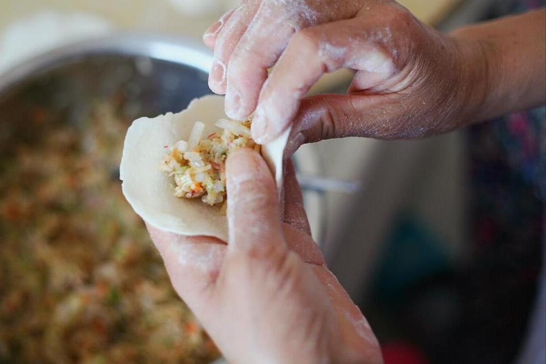 5、隨後將醒發好的麪糰拿出來,放到案板上揉搓排氣,接下來搓成長條狀,然後將其切成一個個的劑子,劑子要大一點,擀成包子皮以後來包包子,把餡料放在包子皮上,然後將其包起來就可以啦。