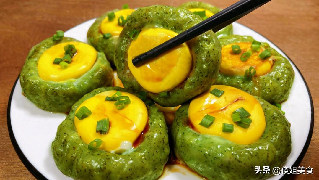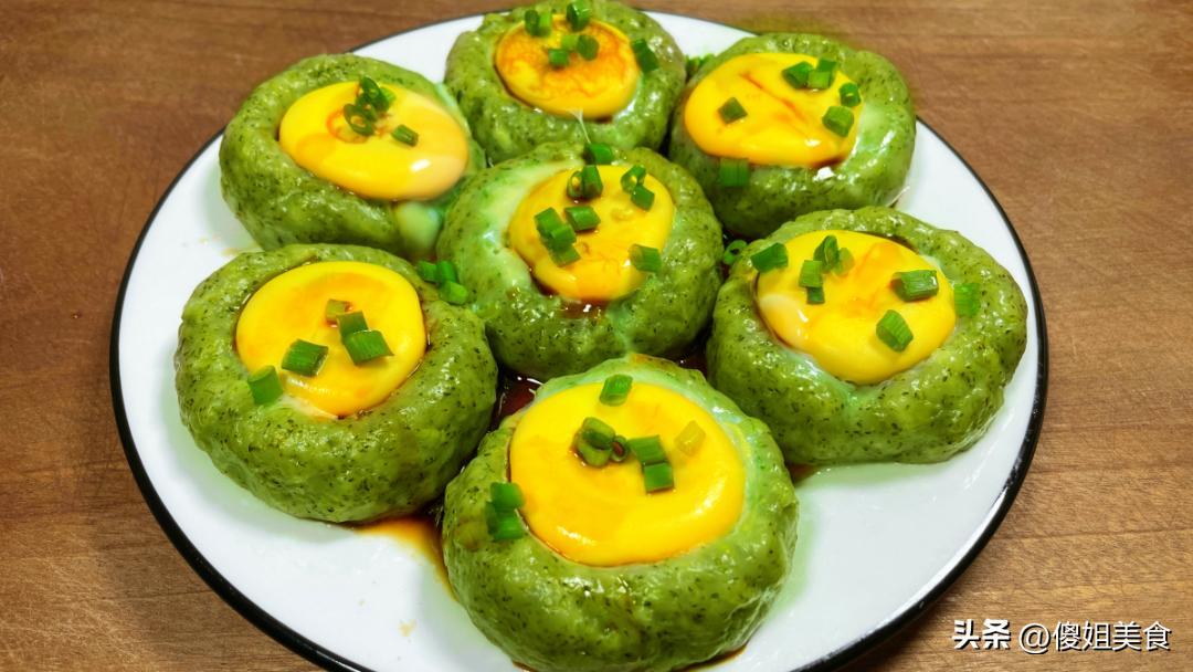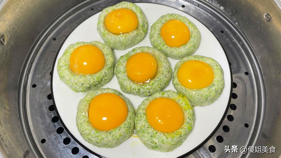 3、所有的西蘭花面坯製作完成後,把蛋黃蛋白分離,蛋黃放進西蘭花面團裏,上鍋大火蒸20分鐘,出鍋後淋入少許生抽,撒上蔥花就可以開喫了,不但營養美味,而且顏值也很高,用來招待客人是非常不錯的一道菜。
