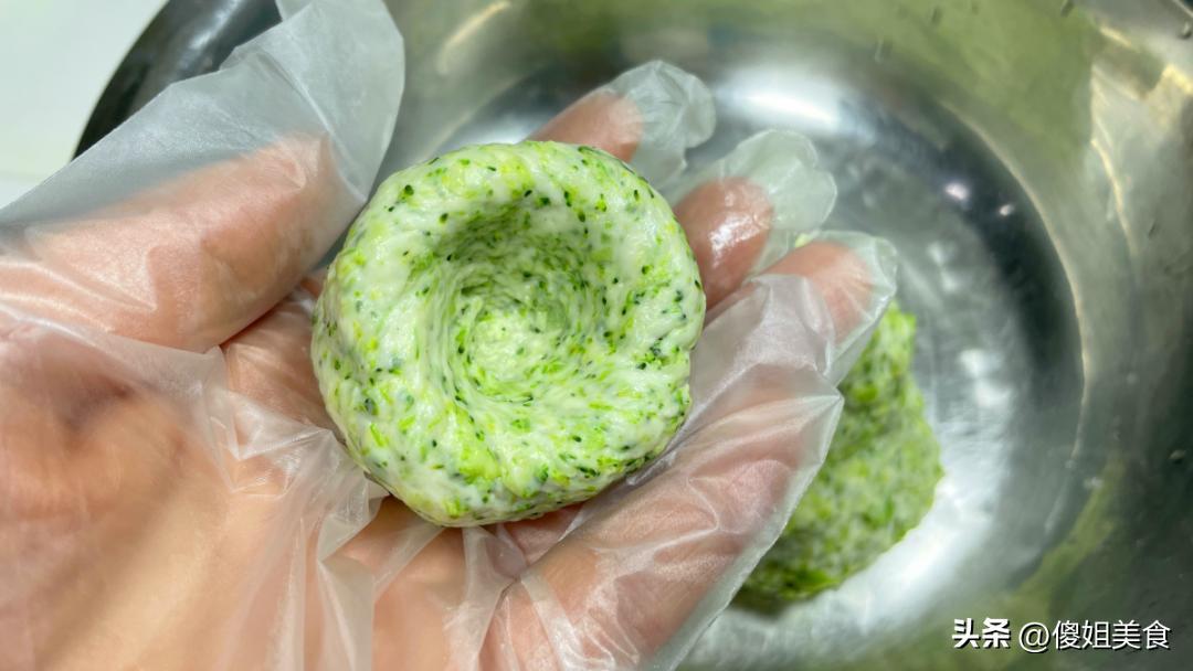具體做法:1、將西蘭花清洗乾淨,焯水撈出控幹水分,放到案板上剁碎,放入盆裏加少許麪粉、澱粉、食鹽,揉成光滑的麪糰,放置一邊醒發10分鐘左右。