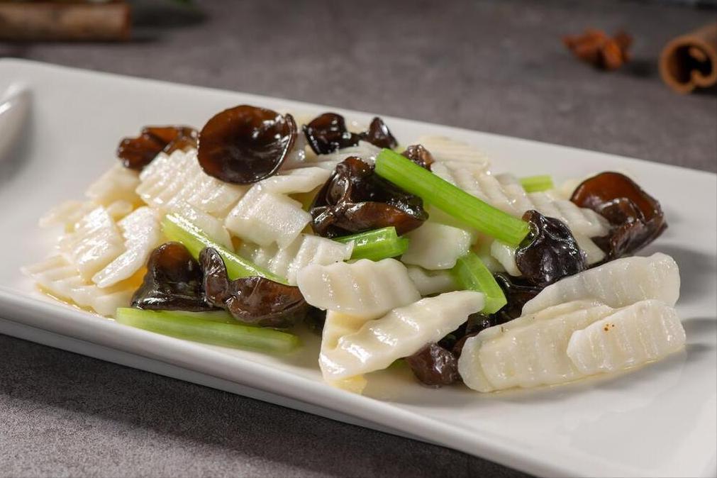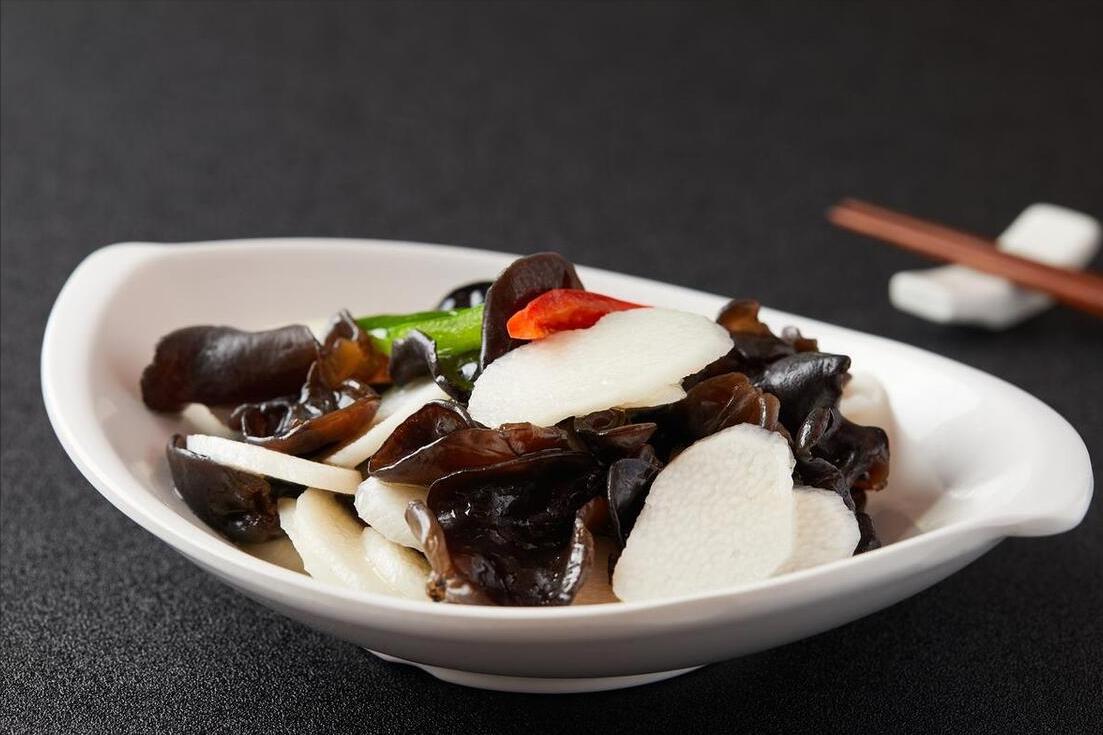 2、之後再把木耳泡上,泡上差不多半個小時就泡發好了,再準備好大蔥切好,下面準備來炒。往鍋子裏倒油,等燒熱之後就可以下入蔥花翻炒了,炒出香味後把山藥和木耳控幹水分,下入油鍋中炒,直至炒熟後用鹽、雞精調味,關火出鍋。