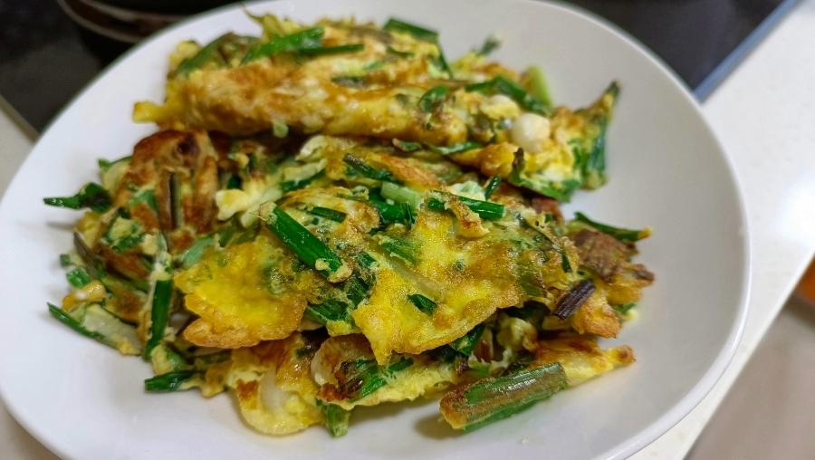 2.起鍋加油,油熱後倒入小根蒜雞蛋液,輕輕晃動鍋,讓蛋液均勻地鋪在鍋底,煎至一面定型後,再翻面繼續煎,煎至兩面都呈金黃色後,再用鏟子翻炒成均勻大小的雞蛋塊,然後就可以出鍋裝盤了,鮮香又下飯!