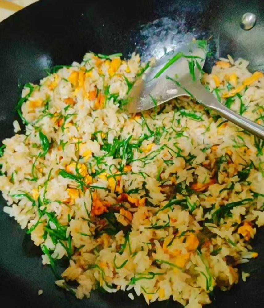 香噴噴的小根蒜葉蛋炒飯就做好了,用小根蒜做蛋炒飯比放蔥花和韭菜都要鮮香好喫,一口一口吃不停,太香了!
