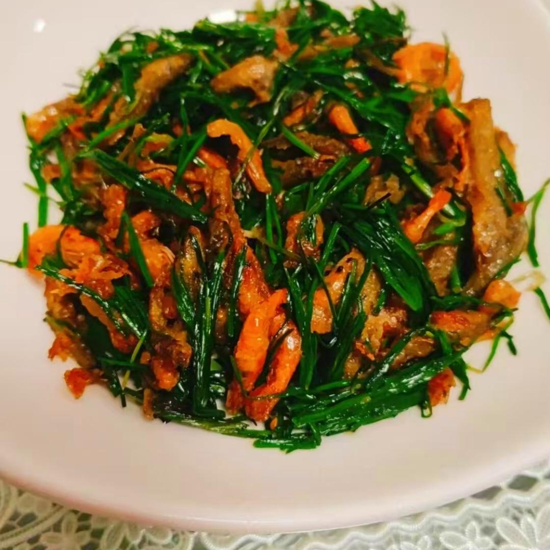 2.熱鍋加油,先下入小蝦米翻炒,炒至蝦米顏色變紅,出香味後再下入切好的小根蒜葉,大火翻炒片刻後,加入適量的食鹽調味,其它調味料都不需要再加,鮮美好喫的小根蒜葉炒蝦米就做好了,鮮得不得了!