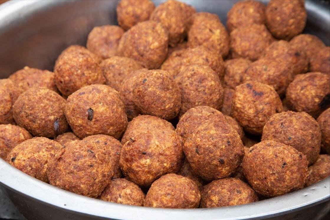 3、接下來,將其分成四個劑子,每一個都放在案板上摔打片刻,這樣可以更上勁,不容易開裂、鬆散,肉餡的質地會更Q彈。接下來將其團成圓圓的丸子,然後起油鍋,燒熱後把丸子下進去,小火慢炸到色澤金黃。
