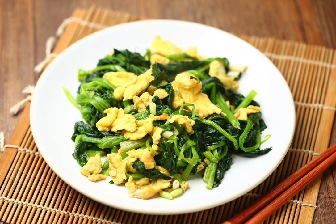 菠菜洗淨後,燒一鍋開水下入菠菜焯水,隨後撈出來過一下涼水,然後將水分控幹,切段。雞蛋打在碗裏,攪散備用,蒜片切好備用。鍋子裏倒油,燒熱之後把雞蛋炒熟後盛出來,重新起油鍋,爆香蒜片中倒入菠菜翻炒,炒到斷生後再將雞蛋倒進去,加上鹽、味精調味,快速炒勻出鍋。