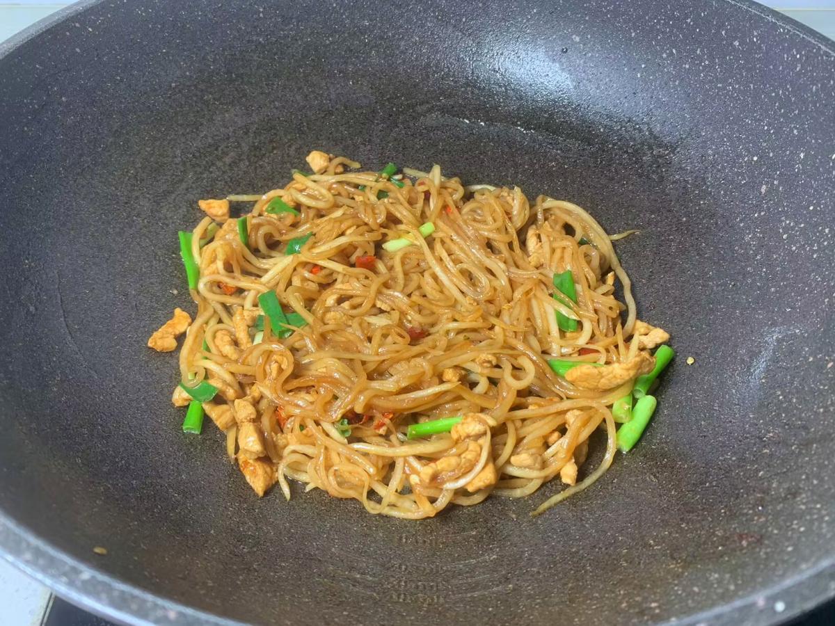 4、大火快速把蘿蔔條炒斷生,關火後撒上適量香蔥,用鏟子翻拌均勻關火盛出。