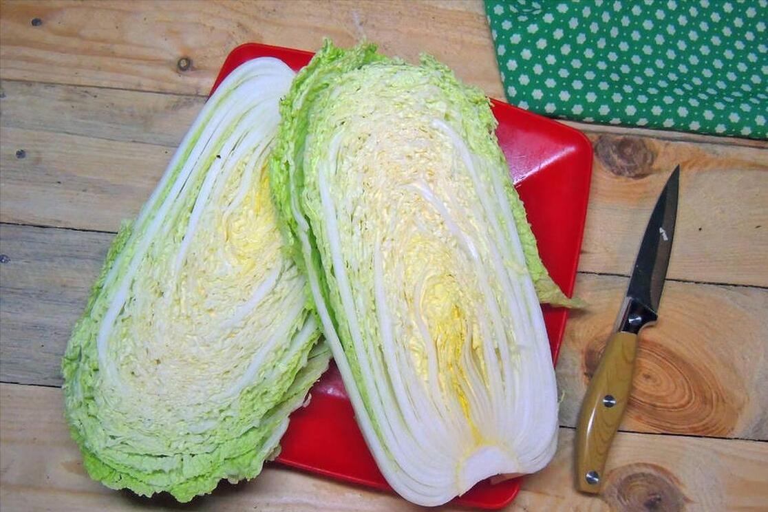 3、直接把白菜對半切開,如果個頭小的話,整個來醃也可以,接下來準備一個容器,保證無水無油,準備來醃製,首先在最底部撒上一層粗鹽或者食鹽,然後鋪上一層大白菜,鋪上以後要使勁按壓一下,儘可能把空隙縮小。