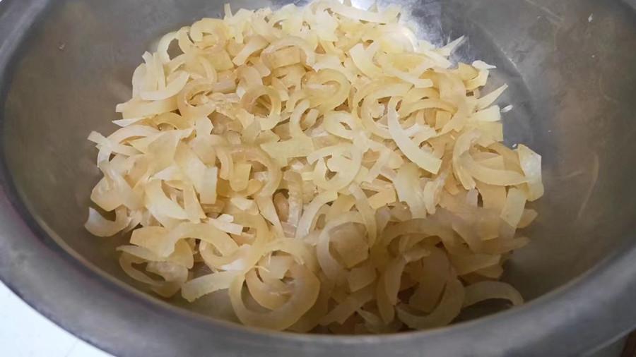 處理好的豬皮按照1:3的比例加入清水,放入盆中,再加入蔥段和薑片,開大火蒸,水開後轉小火繼續蒸一個小時左右。時間到了後關火,撈出蔥姜不要自然晾涼即可;如果喜歡顏色深口味稍重的,也可以在關火前10分鐘加入適量的生抽和少許老抽調色。