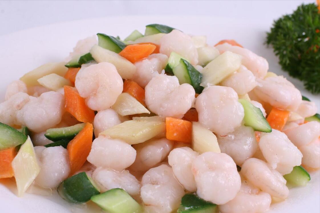 用到:大蝦、玉米粒、胡蘿蔔、青豆、大蒜、鹽、雞精、蠔油、水澱粉