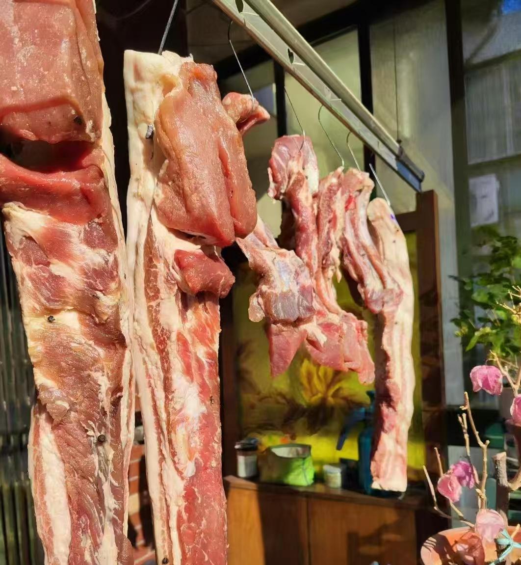 5、晾曬:在醃製完成後,將肉取出,先用100度的沸水燙一下,然後用繩子穿好,掛在通風良好、避免陽光直射的地方晾乾。這個過程需要耐心等待,大約一週左右,臘肉就基本晾乾。
