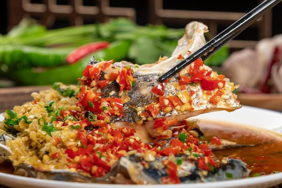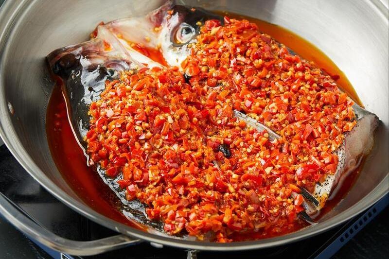 2、接下來準備好盤子,在底部鋪上薑片,然後把醃製好的魚頭鋪上去,在上面鋪滿紅剁椒。鍋中燒水,燒開後把魚頭放上去大火蒸15分鐘,就可以出鍋了,出鍋以後鍋中燒點熱油,將其澆在魚頭上面就可以啦,最後撒上蔥花,開喫!