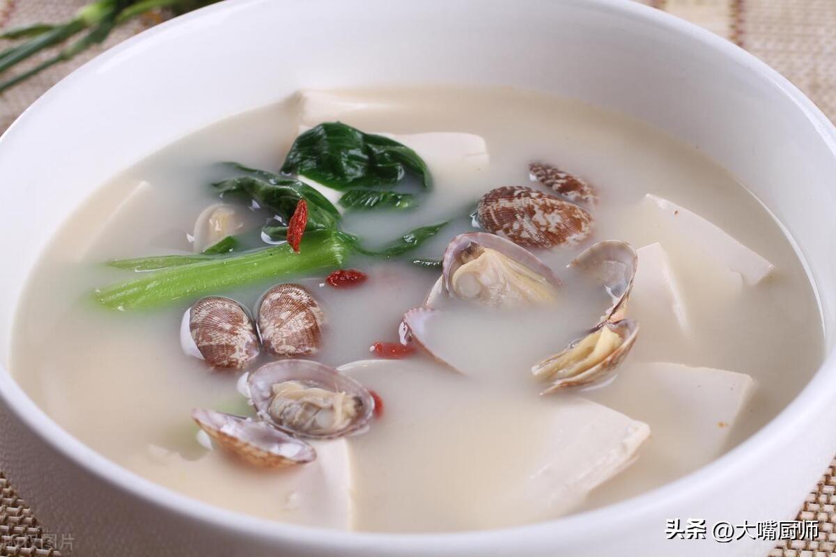 3、花甲豆腐湯:準備食材:花甲、嫩豆腐、生薑、香蔥、食鹽、料酒、胡椒粉。烹飪步驟:將處理好的花甲焯水備用,嫩豆腐切塊,生薑切片,香蔥切段。鍋中加水燒開,放入生薑片和料酒,再加入豆腐塊和花甲。煮至花甲開口,豆腐浮起,加入食鹽和胡椒粉調味。撒上香蔥段即可出鍋。