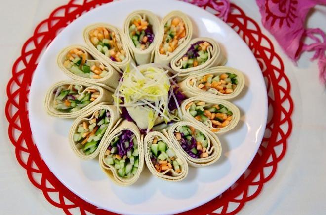 4千張平鋪,上面放菠菜,雞蛋絲,胡蘿蔔絲,捲起來