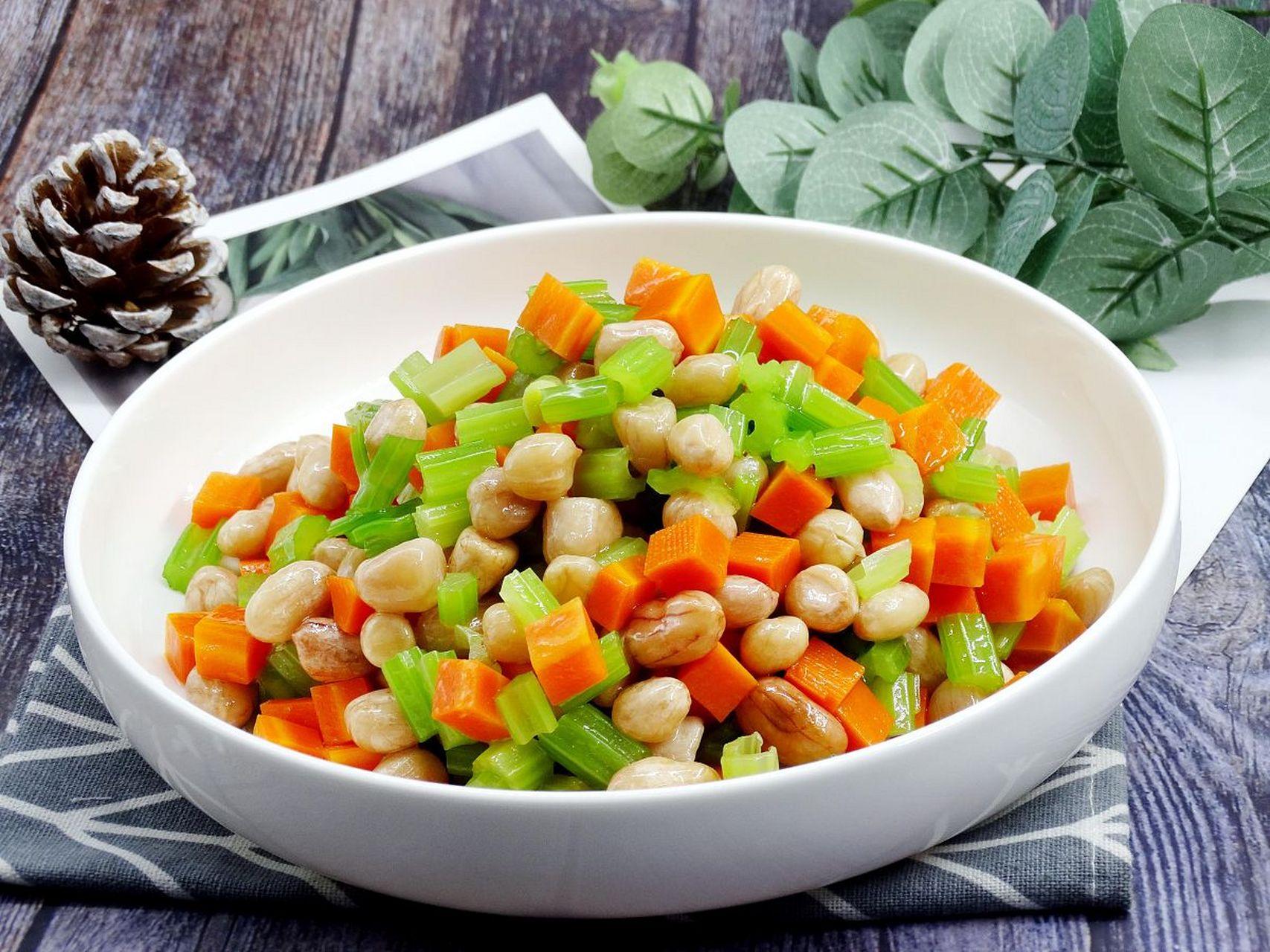 食材;芹菜2根,花生,胡蘿蔔半個,蔥薑蒜,鹽,醋,味極鮮