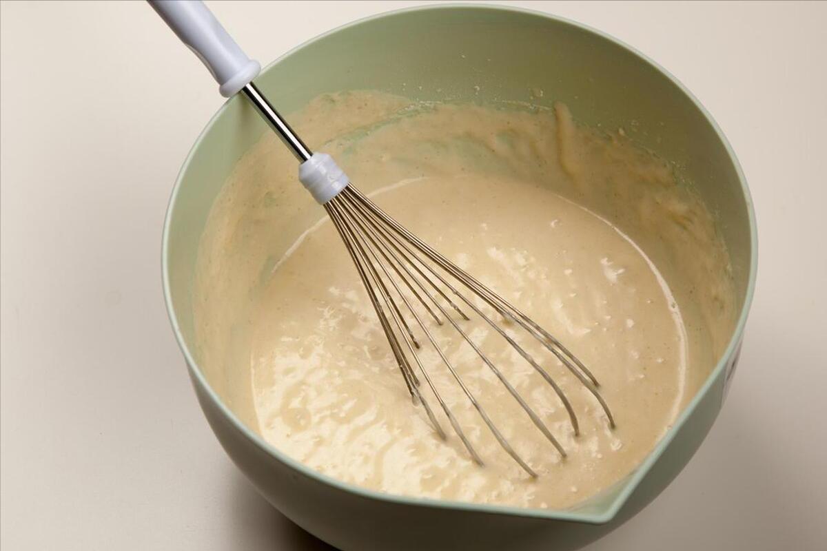 3、接下來,準備一個小盆,往裏面倒上2勺麪粉、1勺澱粉、1個雞蛋,再來一點點小蘇打,接着用適量的鹽、味精、五香粉來調味,充分攪拌均勻以後,往裏面倒上適量的啤酒來調製麪糊,完全攪拌成稀稠適中的麪糊。