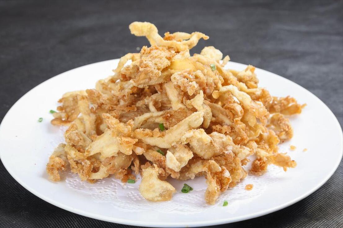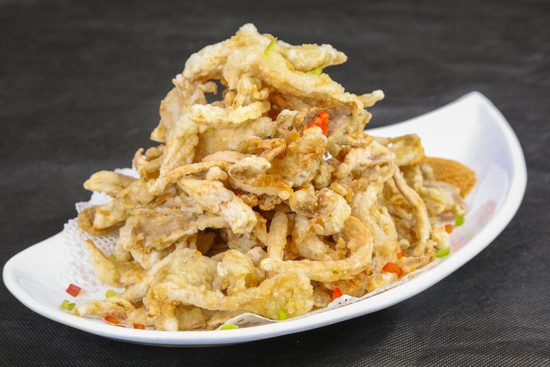 2、在這裏就有技巧了,平菇上面的水分,不管是控幹、擦乾還是晾乾,總之就是徹底乾透以後才能來炸,否則炸出來就會軟趴趴的不好喫,乾透了再來炸的話,就是酥脆的,這是第1招。