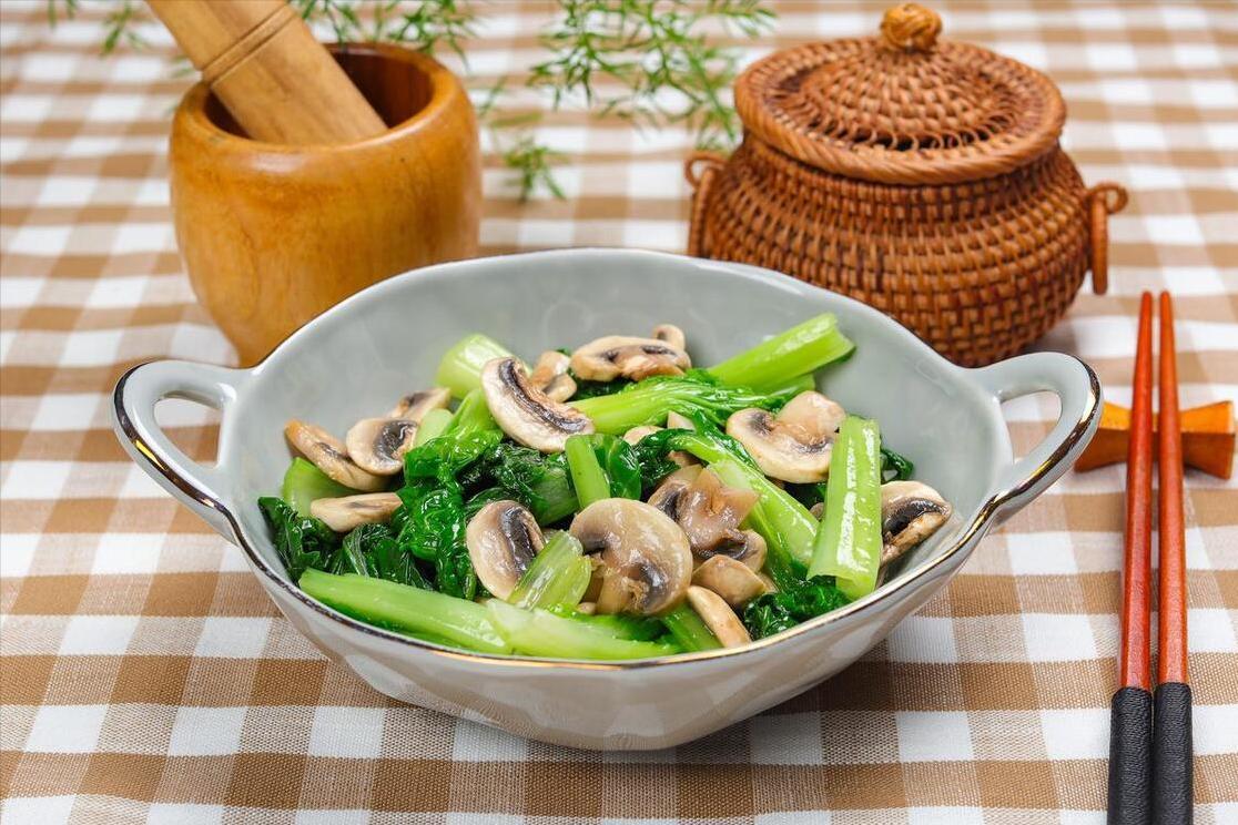 材料:口蘑、青菜、鹽、味精、大蒜、食用油