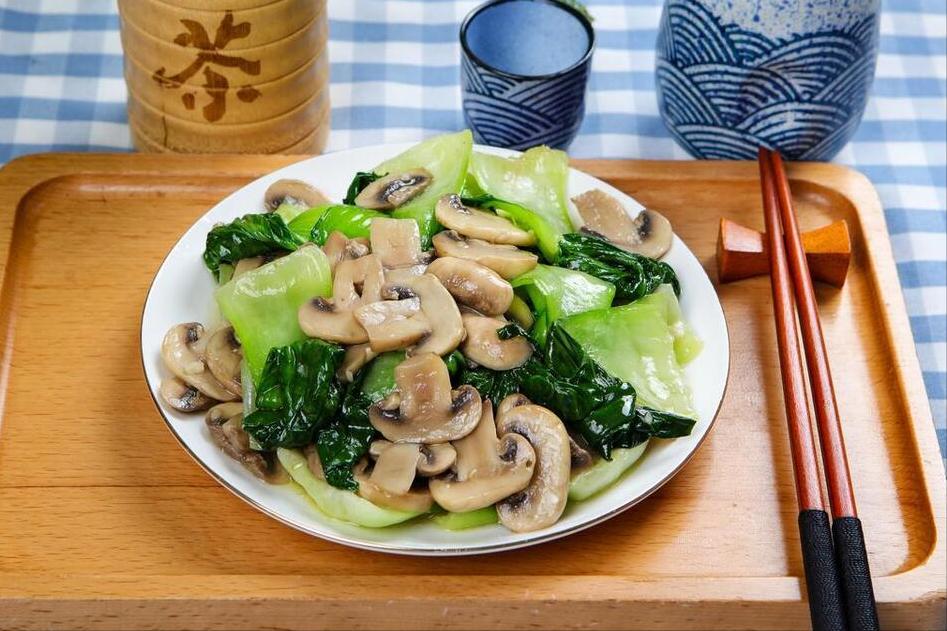 口蘑洗淨之後,切成薄片,青菜摘洗乾淨後,切成小段,再把大蒜切一下,切成蒜片或者蒜末備用。接下來往鍋子裏倒油,等燒熱後爆香大蒜,接着倒入口蘑翻炒,翻炒片刻直至斷生後,將青菜倒進去繼續炒,炒熟以後加上鹽、味精調味,就可以出鍋啦。