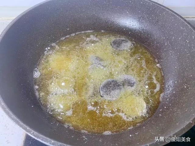 3、鍋中多倒一些油,油溫5成熱左右,一片一片下入糯米腸,不要一次性倒入鍋中,那樣就結團了,中小火慢炸,炸至兩面金黃,撈出控油。
