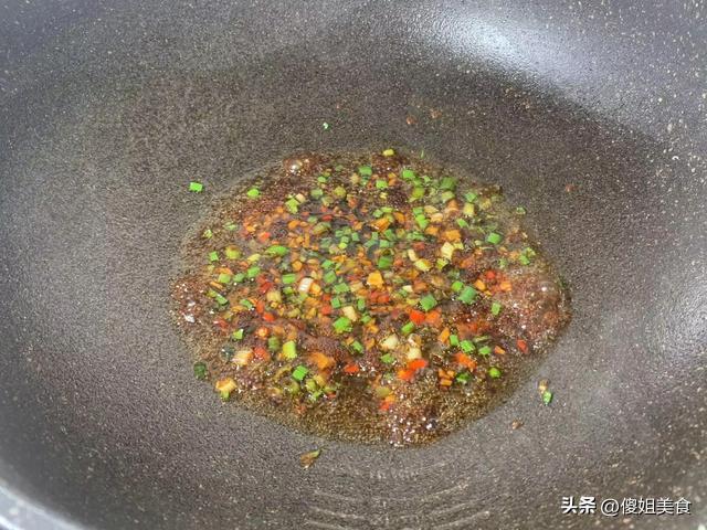 4、鍋中留少許底油,放入蔥薑末、紅椒丁炒出香味,接着加少許白糖,適量味極鮮、蠔油,翻炒均勻,把湯汁煮沸騰。
