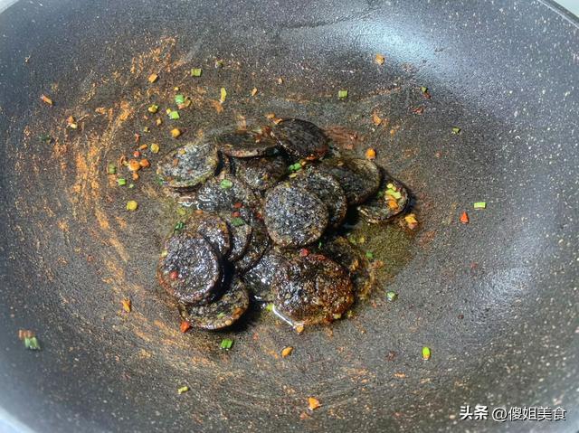 5、然後倒入炸好的糯米腸,翻炒均勻,使每一塊鴨血腸都裹上濃郁的湯汁,炒至湯汁略微收幹即可出鍋。