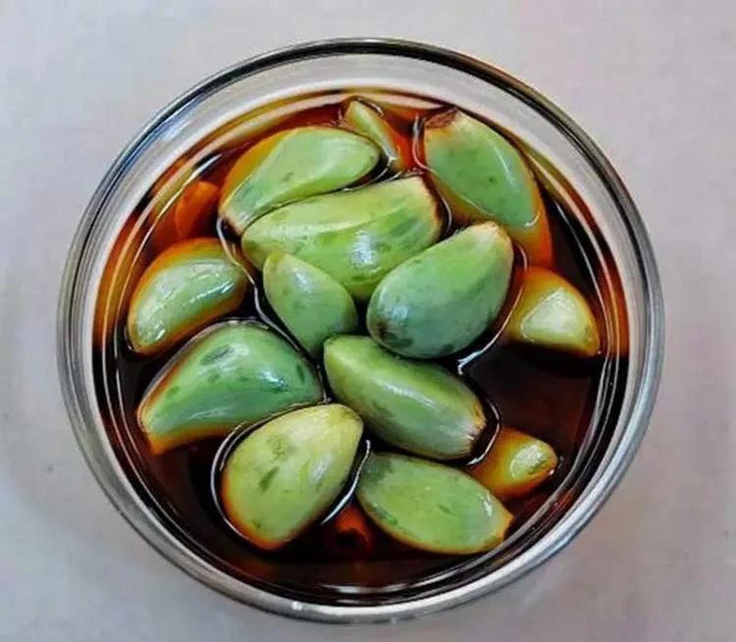 4半個月後就可以喫了。蒜就會變綠,如同翡翠碧玉。