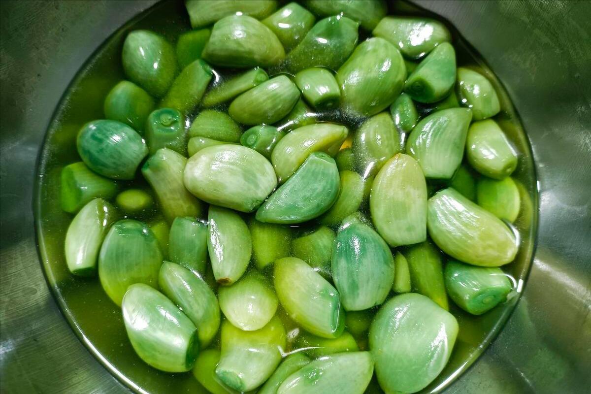 2、首先來處理大蒜,將大蒜一個一個的剝皮,去皮以後這裏有個技巧,需要將大蒜的根部,切掉一小部分,能看到裏面的芯就可以了。這樣切掉一塊,大蒜在醃製時,會更容易入味,更容易醃透,促使其快速變綠,這是第1招。