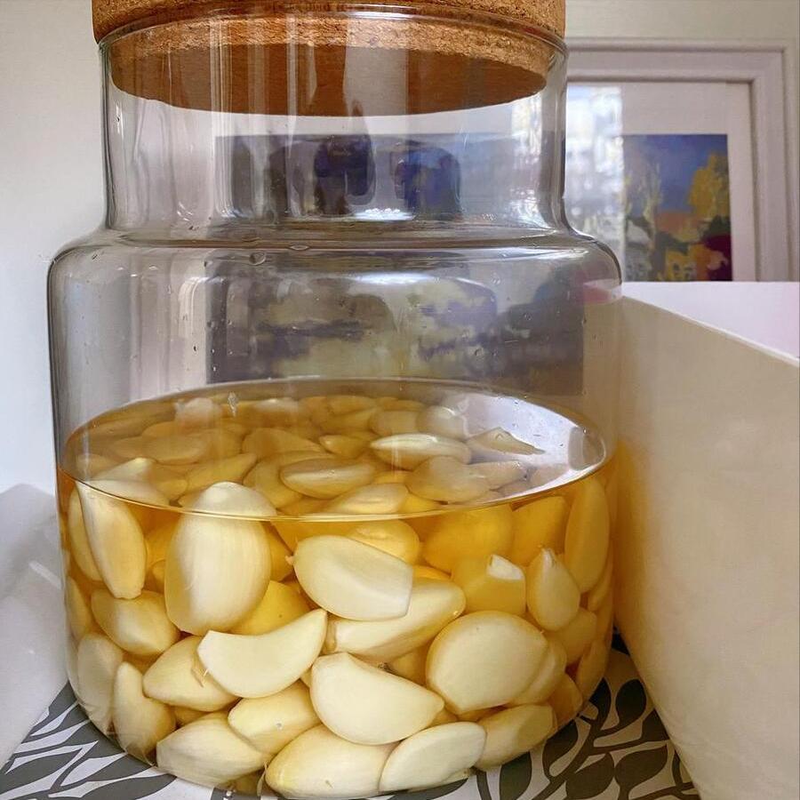3、接下來準備一個罐子,把罐子提前用開水燙一下,沖洗乾淨,保證無水無油,然後將處理好的大蒜倒進去,這個時候就要往裏面倒醋了,但是在醋的選擇上,也是有技巧的,陳醋、白醋都不行。