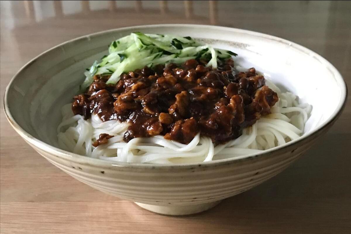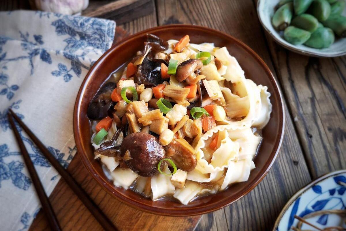 食材:麪條、豆腐乾、杏鮑菇、黃豆、豬肉、胡蘿蔔、木耳、鹽、白糖、豆瓣醬、蔥花、食用油
