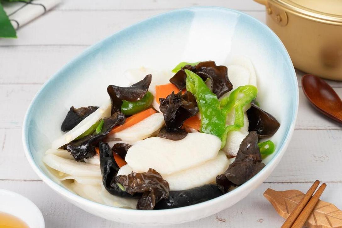 用到:山藥、木耳、蔥花、青椒、胡蘿蔔、鹽、味精、食用油