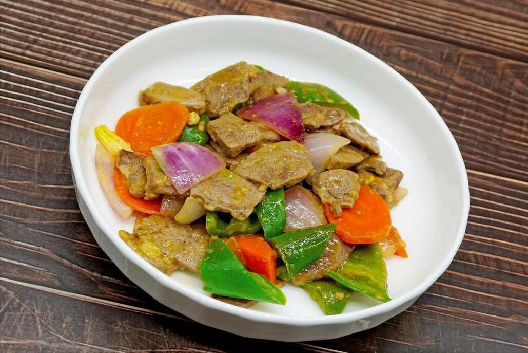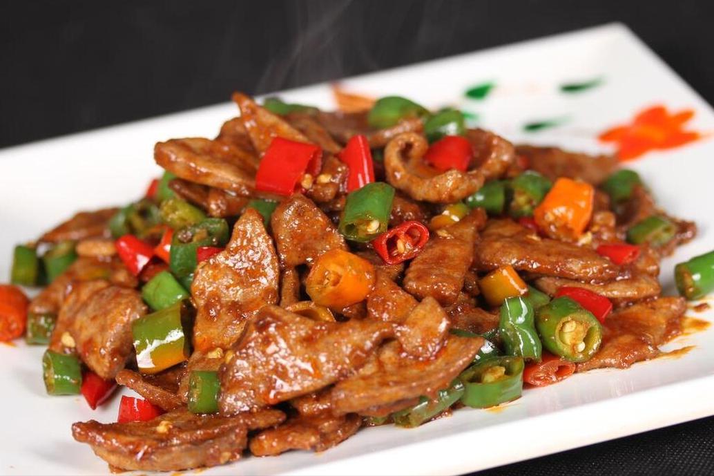 用到:豬肝、蔥姜、青紅辣椒、洋蔥、鹽、味精、白胡椒粉、生抽、蠔油、澱粉、食用油