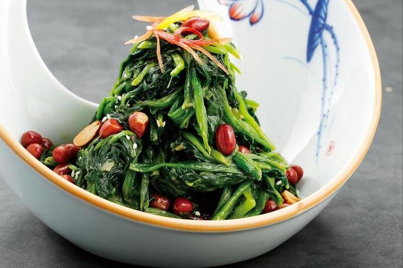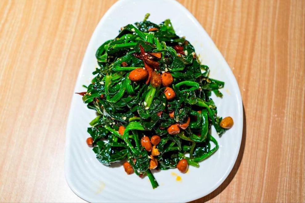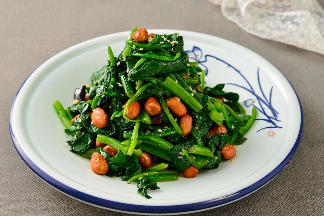 食材:菠菜、花生米、大蒜、幹辣椒、鹽、味精、白糖、生抽、醋、香油、花椒油