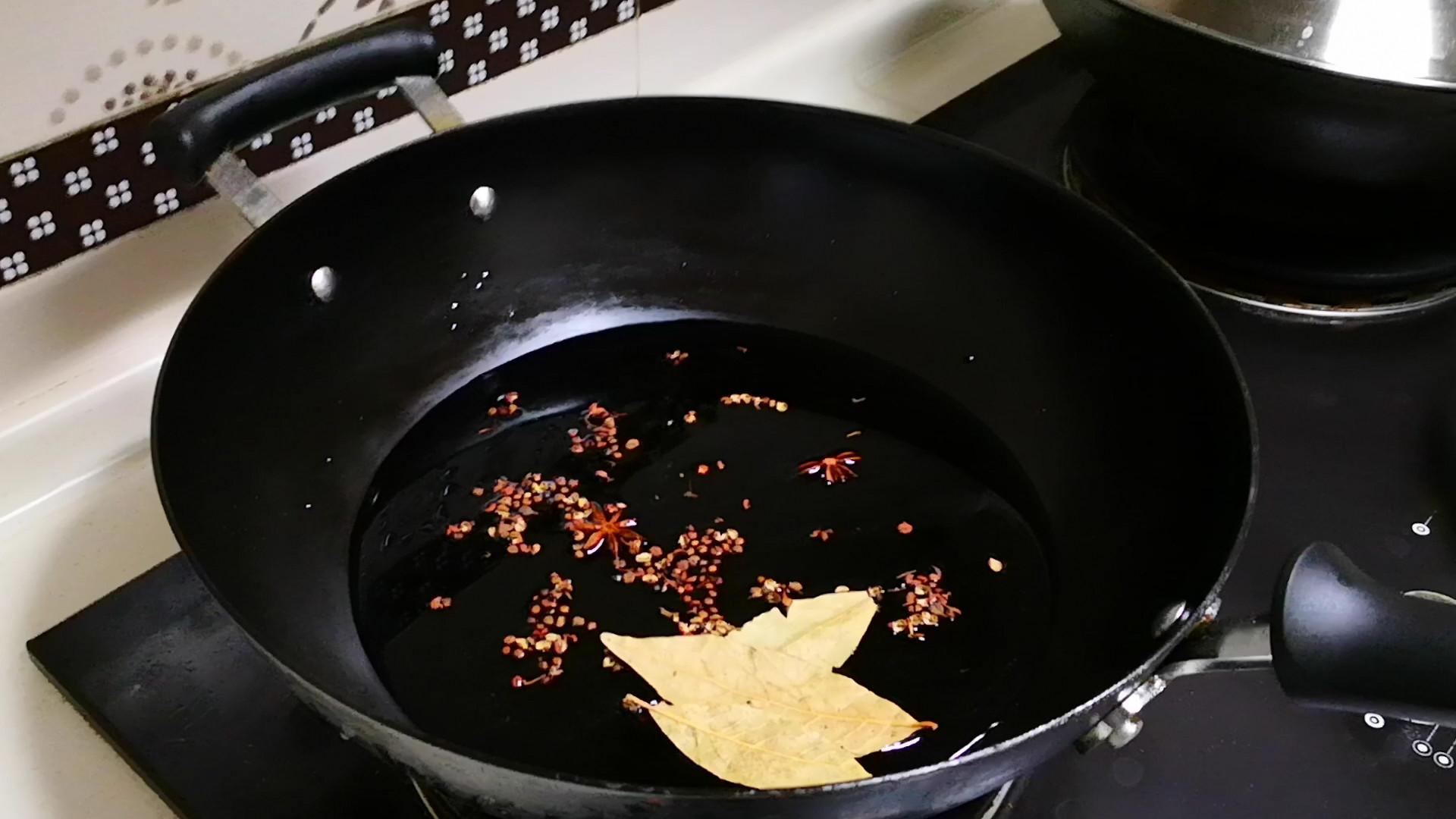 3、調製料汁:花椒、小茴香、香葉、陳皮、八角再配上一些幹辣椒,用小火慢慢炒香,等香味出來後加入500克的醬油、500克的生抽和清水,再加入30克的鹽和兩把冰糖,然後大火燒開,晾涼備用。