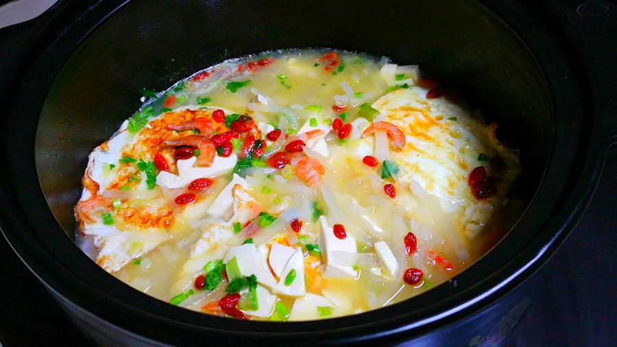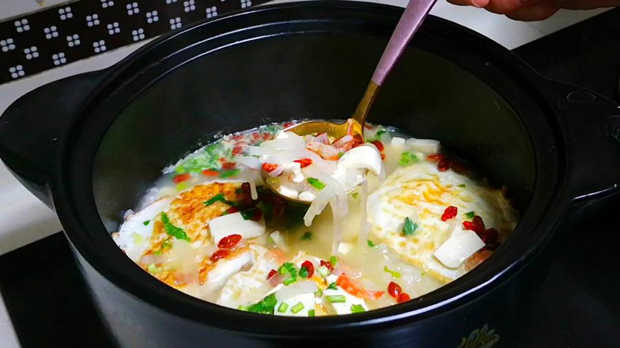 3.再起鍋加少許油,油熱後先下入薑絲和蔥花翻炒,炒香後再下入白蘿蔔絲,大約翻炒1分鐘後倒入適量的開水,然後將其轉移到砂鍋中,接着將煎好的荷包蛋放入,再放入切好的豆腐,撒上一小把蝦仁增鮮,然後蓋上鍋蓋慢慢燉煮。