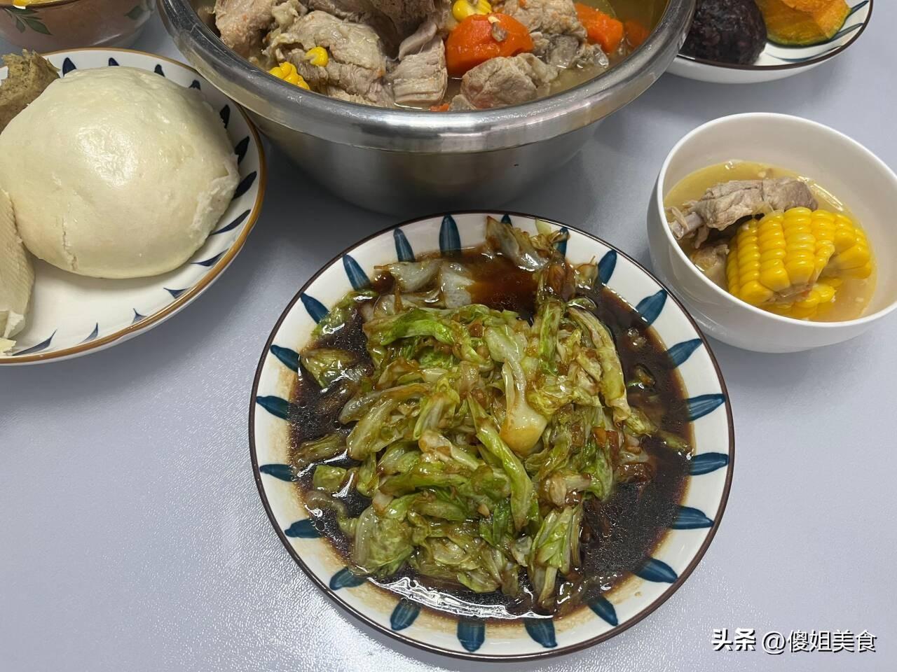 婆婆做飯都是葷素搭配的很好,炒了個手撕包菜,包菜不要用刀切,用手撕成塊就可以,清洗乾淨後瀝乾水分,用蒜末熗鍋,放點蠔油、味極鮮調味,大火爆炒熟就可以出鍋了。包菜這樣一炒清脆鮮美,好喫又下飯。