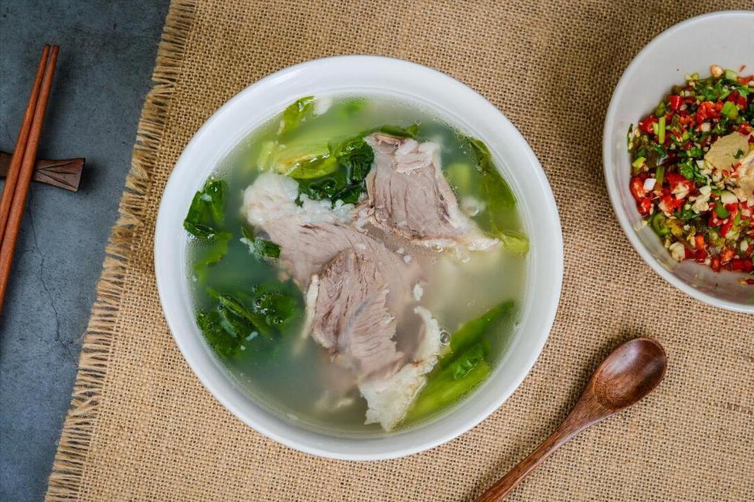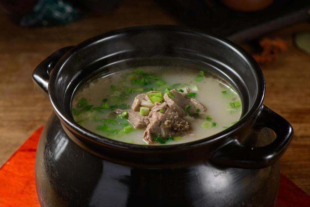 羊肉洗淨之後,冷水下鍋加上料酒來焯水,焯水之後撈出來,之後重新準備乾淨的鍋子,把羊肉倒進去,然後放上蔥段、薑片開始煮。大火燒開之後,保持小火接着煮1個小時,煮好之後加上鹽、白胡椒粉來調味,用勺子攪拌均勻,關火開喝。
