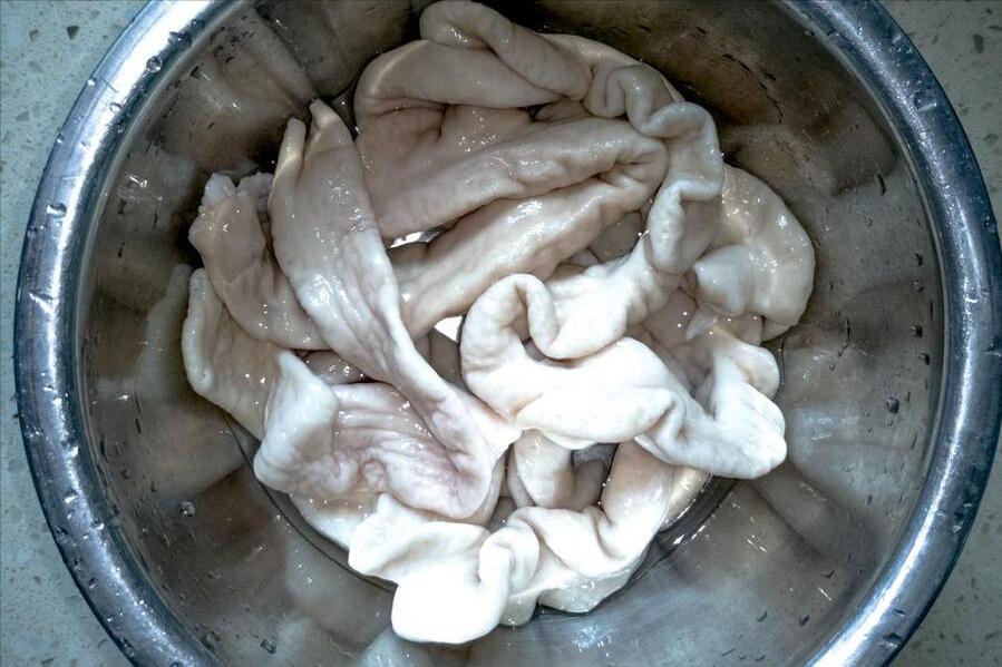 6、這樣咱們的豬大腸,就徹底處理好了,最後可以下鍋焯一下水,然後就可以開始烹飪了,嚐嚐看是不是沒有奇怪的味道,有的只是香味,喜歡喫豬大腸,但是不會清洗的,試試這方法吧!