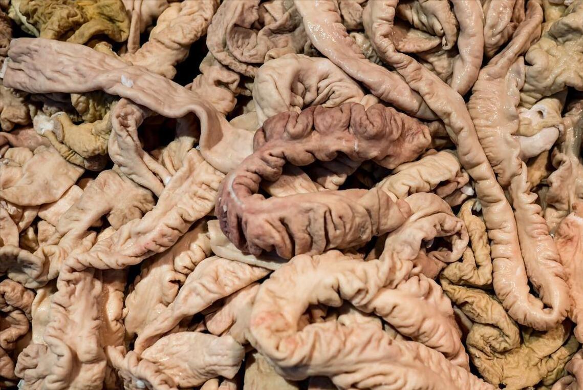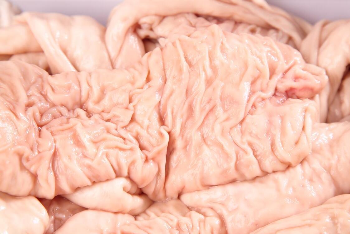 2、翻面之後的豬大腸,會看到上面有一些白色的多餘的東西,其實這是肥油,這塊東西能喫,當然了很少有人能接受它的味道,所以在處理的時候,把這塊撕下來扔掉就行,然後將水分控幹。
