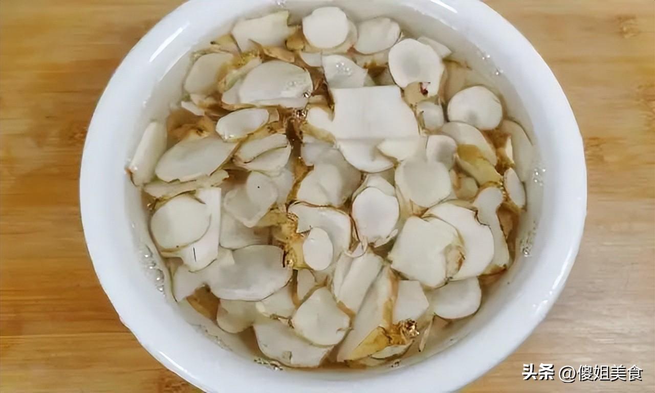 2、將鬼子姜切成薄片,放入清水中浸泡10分鐘,去掉多餘的雜質和澱粉,撈出後瀝乾水分備用。