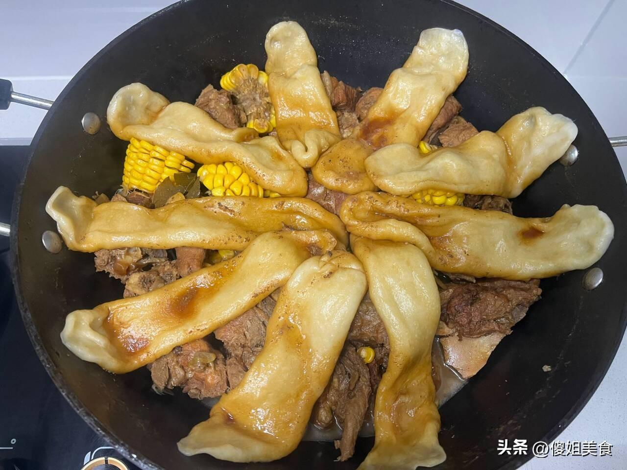 大骨頭燉差不多的時候,撒上適量的食鹽,再放入切好的玉米段,上面再鋪上一層鍋貼,鍋貼的麪糰不用放酵母,直接和好麪糰就可以,拉伸放在骨頭上面就可以了,蓋好蓋子中火燉15分鐘,最後大火收一下湯汁就可以了。把鍋貼取出來,撒上點蒜末、倒點香油攪拌一下盛到大碗內。
