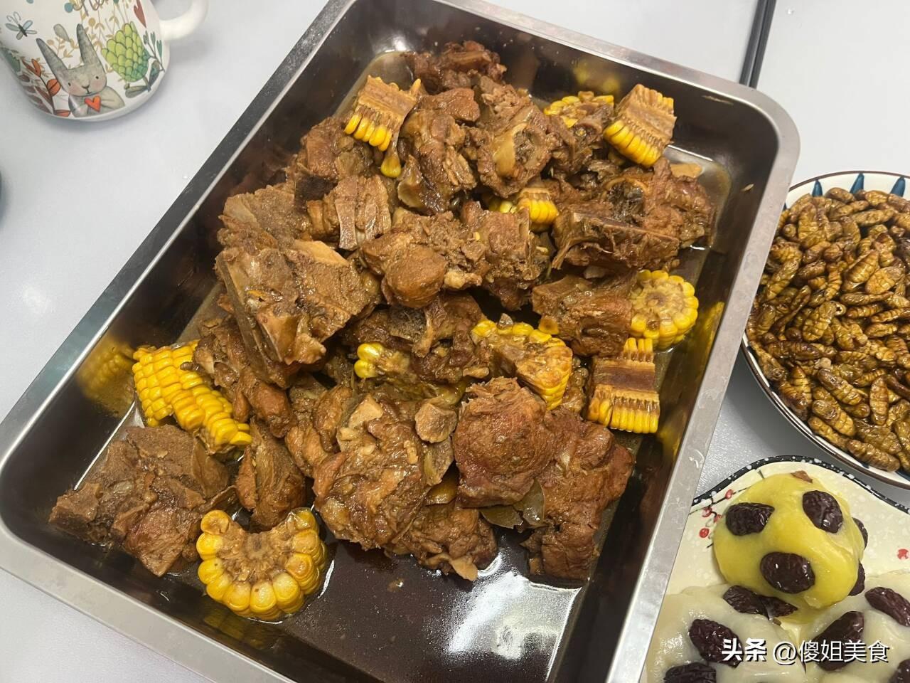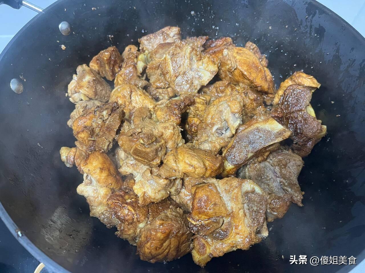 弟媳婦說一大早就去才菜市場買排骨了,但還是去的有點晚了,沒有買到純肋排,只剩下大骨頭了。大骨頭更好喫,帶的肉多,香,買了5斤大骨頭花了45塊錢,便宜又好喫。大骨頭用清水多清洗幾遍,一定要焯水後在燉,不然大骨頭會很腥,影響口感。焯水後的大骨頭用白糖煸炒上糖色,炒好糖色後再倒少許的醬油、2勺味極鮮、2個八角、1片香葉、蔥姜段炒出香味,接下來往鍋裏倒入適量的溫開水沒過骨頭(一定要溫開水,冷水的話骨頭燉熟會發柴),蓋上鍋蓋小火燉2個小時。