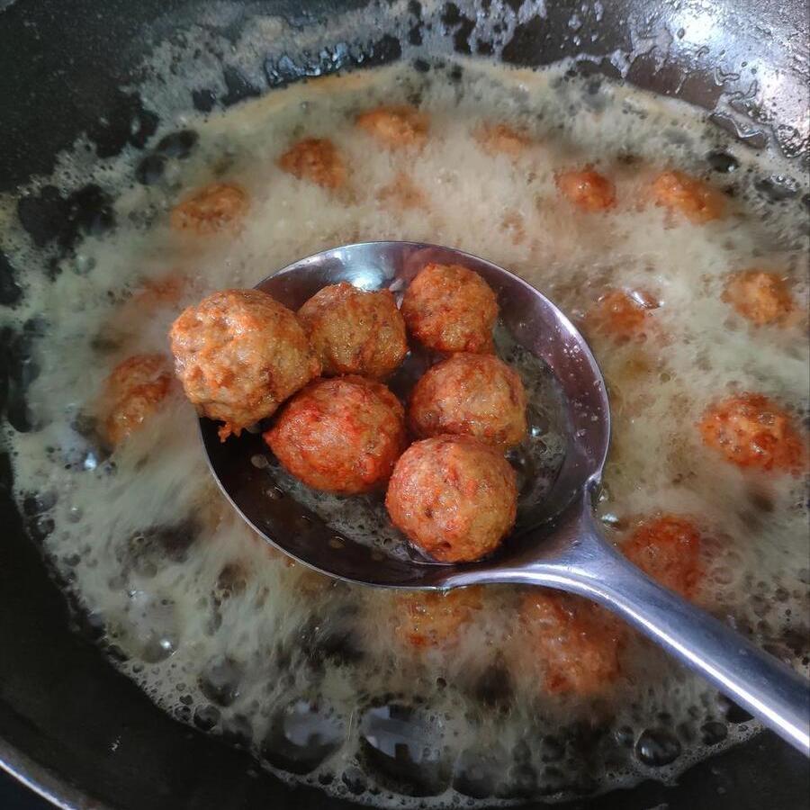 5、炸的時候,全程要保持小火,小火炸到色澤金黃之後,就可以出鍋啦。出鍋之後,如果想要喫起來更酥脆的話,就得復炸一次,鍋子裏的油再燒熱一點,把肉丸子下進去,炸上15秒鐘左右,顏色焦黃之後,撈出來開喫,嚐嚐看是不是特酥脆!