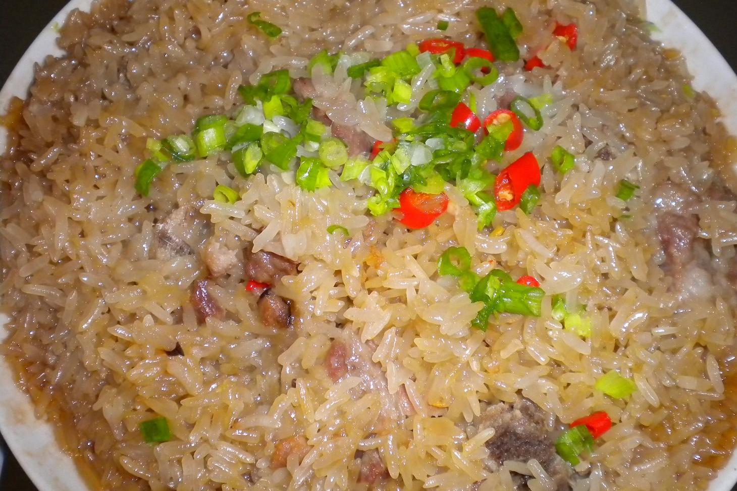 6大米糯米放進電飯鍋裏,加入溫水,倒進炒的食材,按煮飯鍵煮飯即可