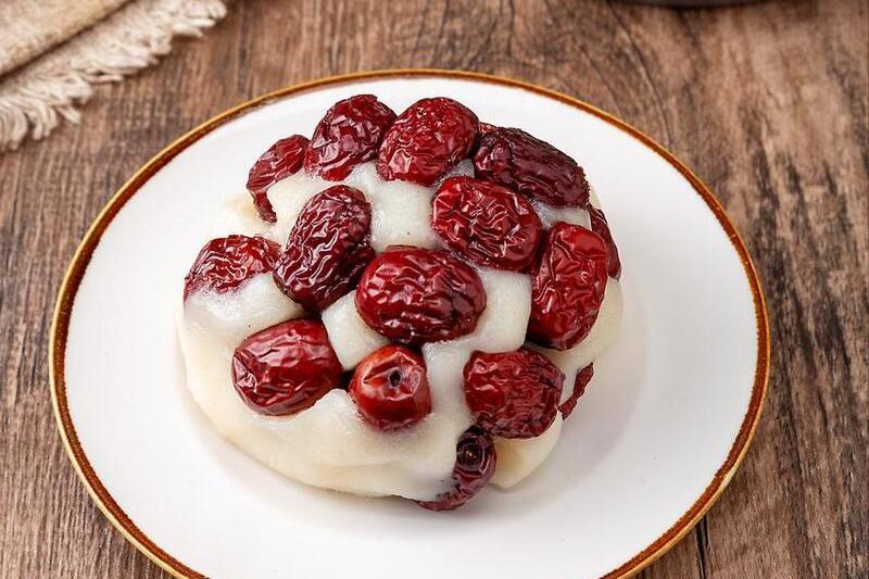 往糯米麪中倒入溫水,充分攪拌均勻,然後取出來一點麪糰,團成年糕的形狀。接下來把紅棗處理一下,洗淨後去掉棗核,然後將其均勻的粘在年糕上,隨後放入鍋中開始蒸,蒸熟後即可開喫。
