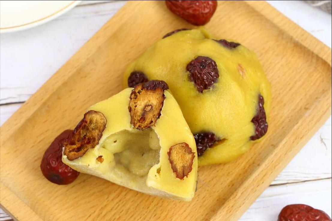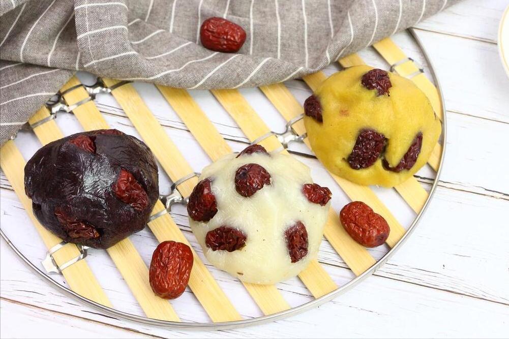 糯米麪倒在小盆裏,加上適量的清水,攪拌均勻之後,我們將其分成數個劑子,每一個劑子都整理成年糕的形狀,然後在表面放上幾個金絲棗,按壓緊實,接下來放在鍋子裏蒸就可以了,蒸熟後取出來,趁熱開喫。