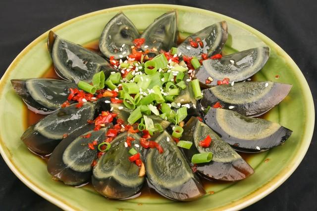 1、皮蛋剝殼後切成小塊,放入盤中。