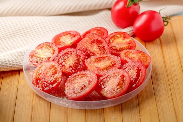 2、將切好的西紅柿放入碗中,加入白糖,攪拌均勻,放置10分鐘左右,待白糖融化,西紅柿出汁即可。