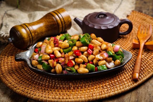 1、鍋中倒入適量食用油,冷油時放入花生米,小火炸至花生米酥脆,撈出控油,放涼備用。