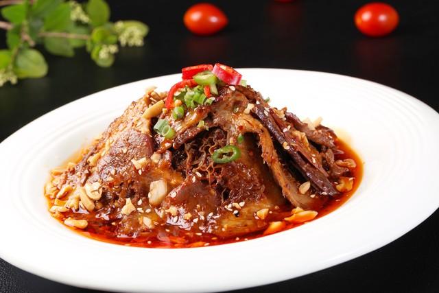 4、將切好的牛肉、牛肚、牛舌放入碗中,倒入調味汁,撒上蔥花和香菜段,攪拌均勻即可。